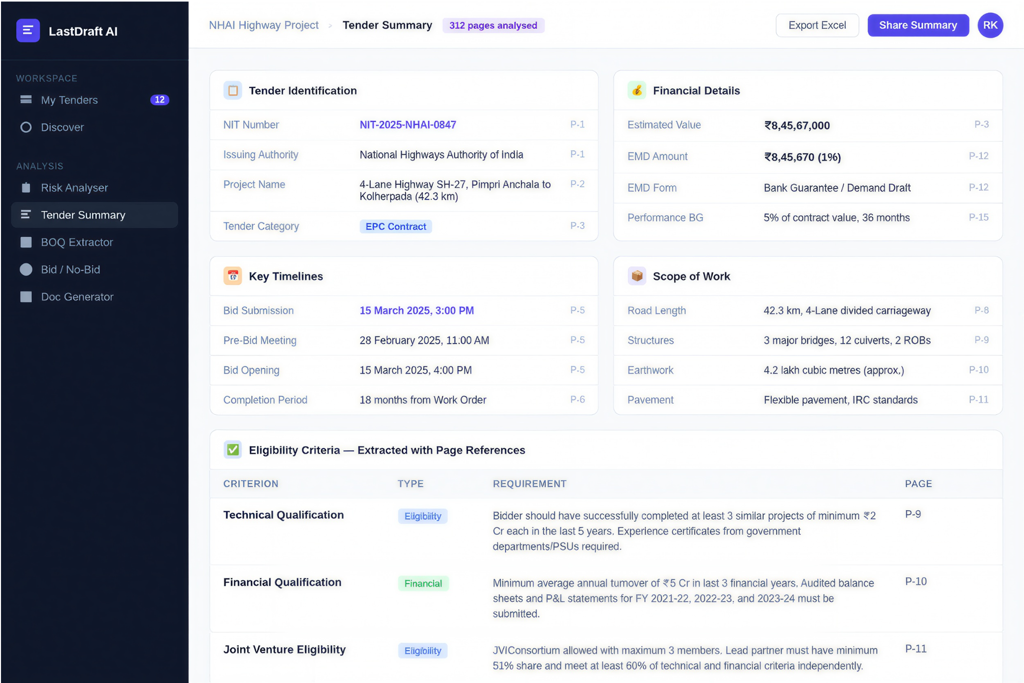 LastDraft AI cut our tender review time from 5 days to under 4 hours. We analyzed a 340-page NHAI highway tender and had a complete risk report before lunch. This is a game-changer for our bid team.